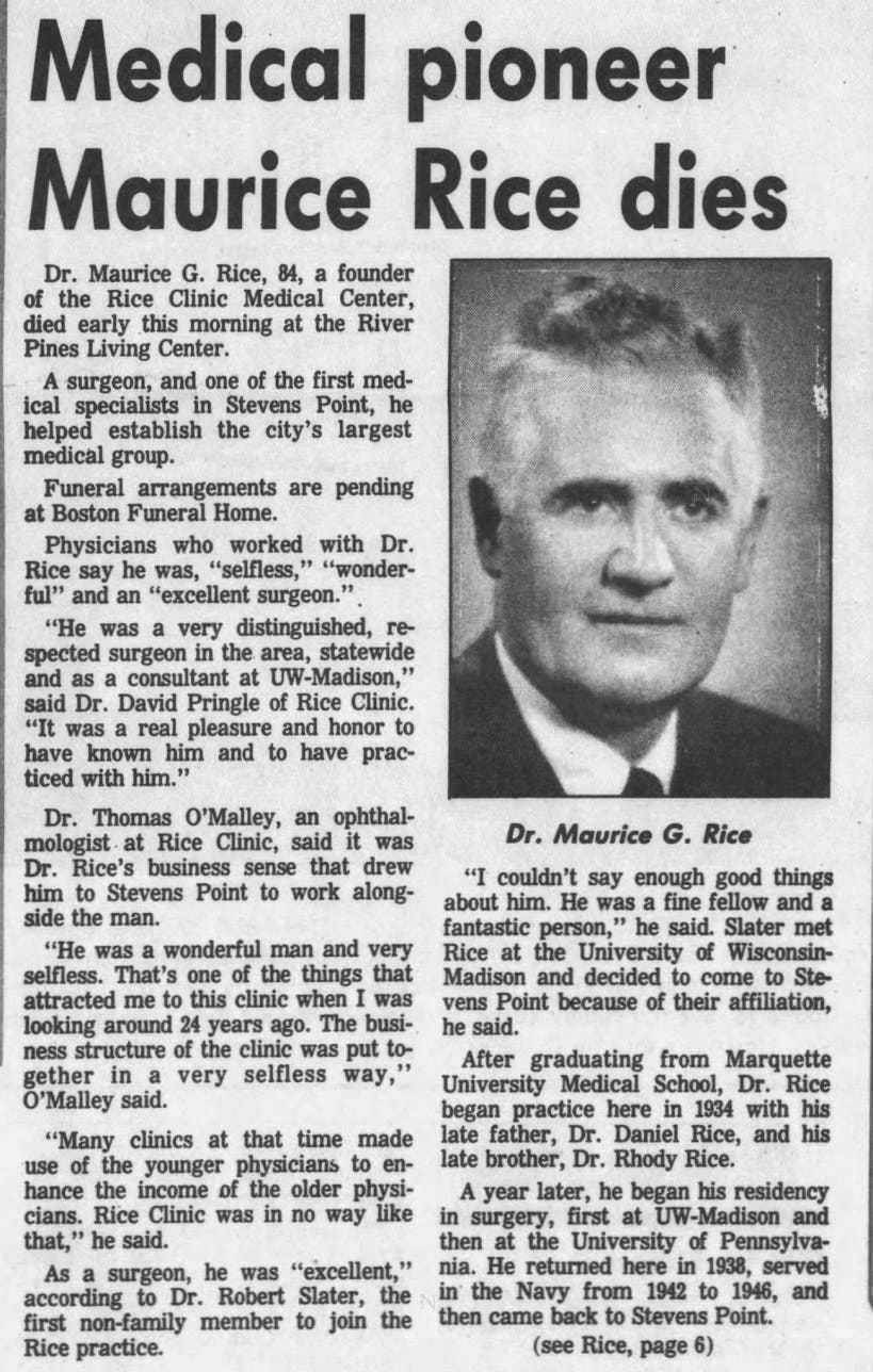 Dr. Maurice Rice retired from active practice in 1971 due to health reasons, eventually working for the Social Security Administration in Madison before returning to Stevens Point in 1980. He passed away on September 9, 1991, at the age of 84.